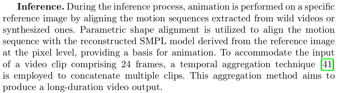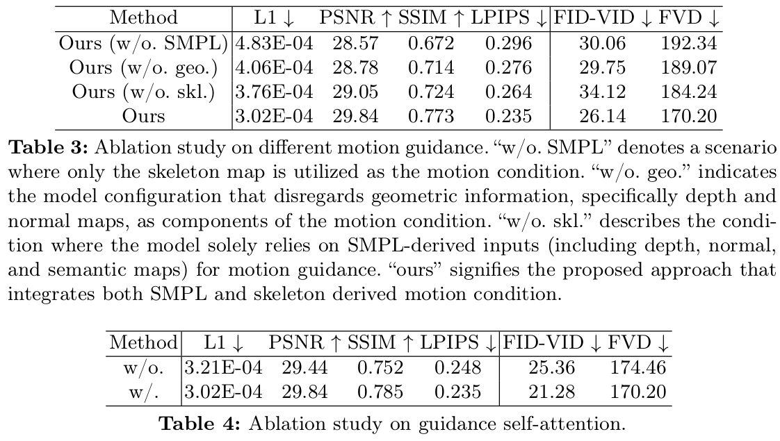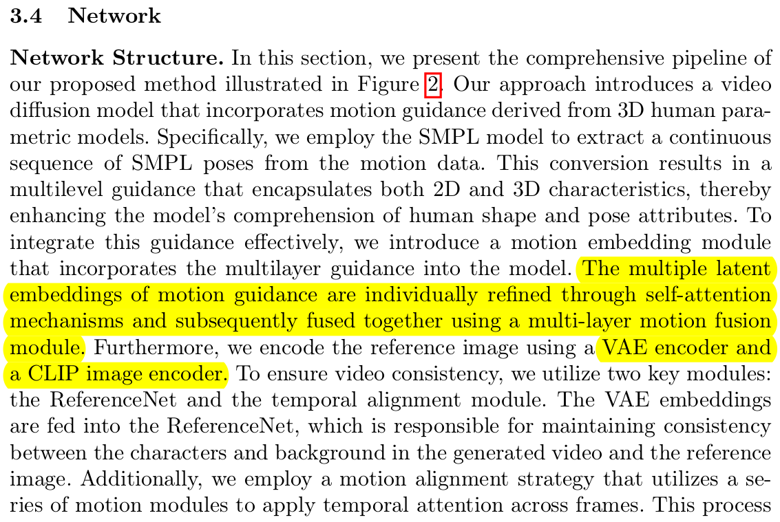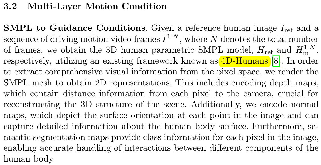 Animate Anyone 이랑 타겟하는 문제가 같다. 입력 이미지 1장 주어지고 pose guidance 여러개 주어졌을 때 해당 이미지 내 사람이 주어진 동작을 하는 영상을 만들어내는 것인데 이 논문의 차이점은 pose guidance를 openpose keypoint가 아닌 SMPL로 확장했다는 점이다. 이전에 dense pose uv map을 쓰는 논문도 있었던 것 같은데 아주 단순한 아이디어를 빠르게 구현한 논문 같다.