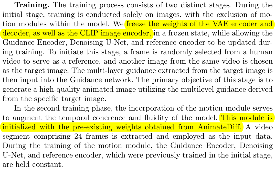 | 네트워크는 animate anyone(animateDiff) 가져다 썼다. self attention으로 각 guidance encoding하고 합친 부분만 구조가 달라짐. VAE CLIP은 원래 있던 것. |