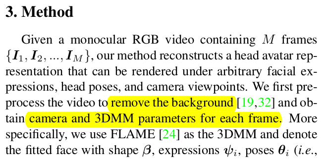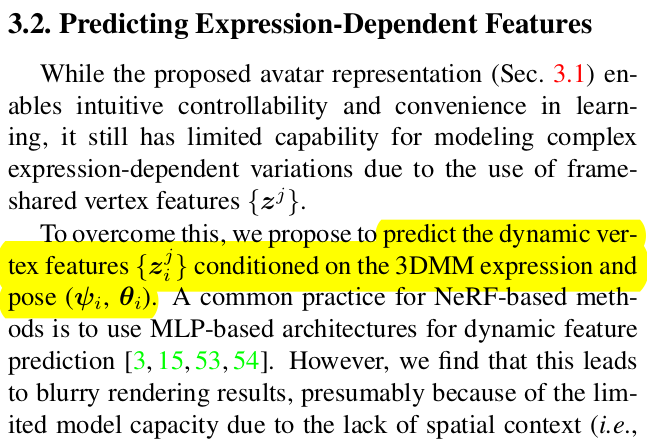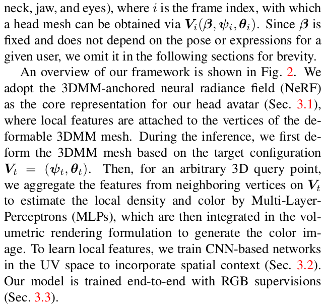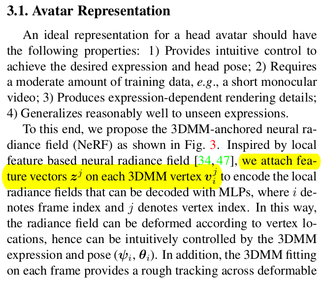 핵심 아이디어는 FLAME vertex 마다 learnable feature를 할당 -> NeRF 방식으로 compositing해서 픽셀화하는 방식으로 학습시키는 것이다. 이제는 좀 알려진 방식이지만 2023년이므로 이게 첫 시작이었지 싶다.
