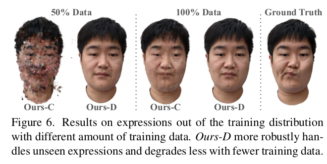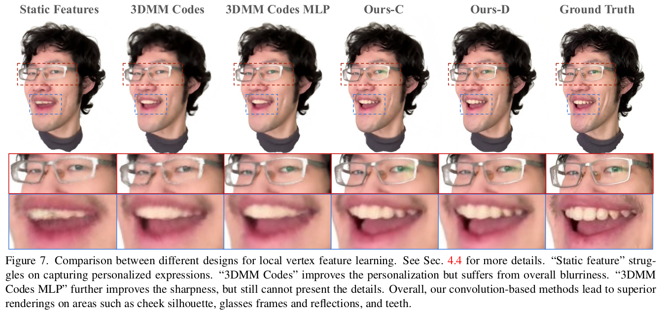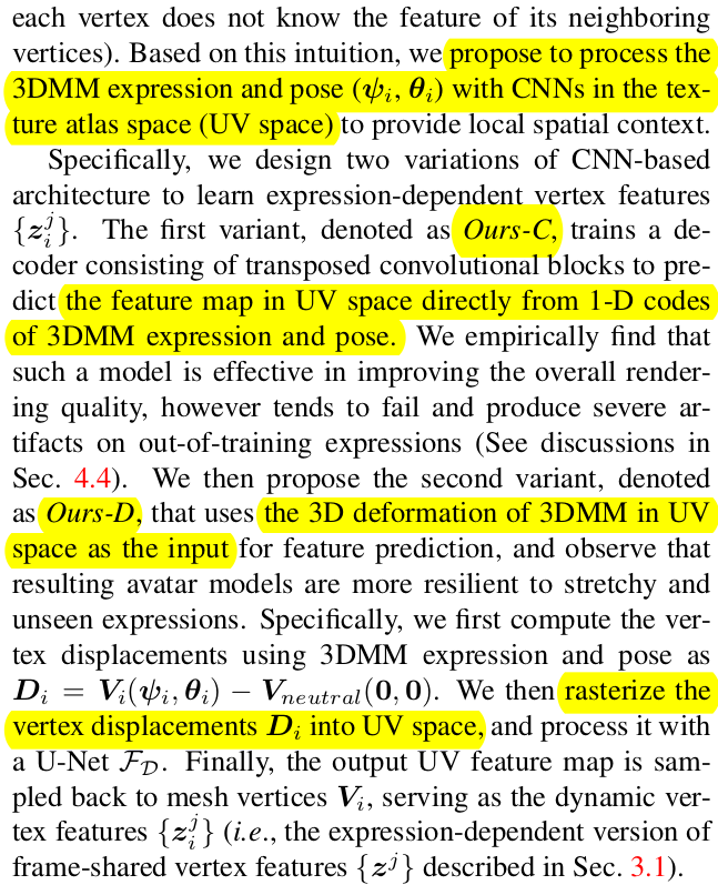 expression에 따라 변화하는 vertex feature를 만들어 내기 위해선 expression-conditioned feature를 추출할 수 있어야 함. 기본적인 방식은 expresssion 넣은 3DMM UV map을 입력받아 바로 feature (ours-C) 추출하는 방식. ==> 성능 구림 그래서 residual UV map 넣는 방식 (ours-D)을 고안함. neutral 3DMM UV map 과 expressed 3DMM UV map 간의 차이를 입력으로 받아서 expressed vertex feature를 만듬. |