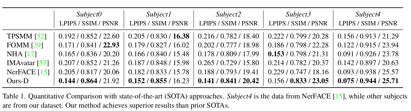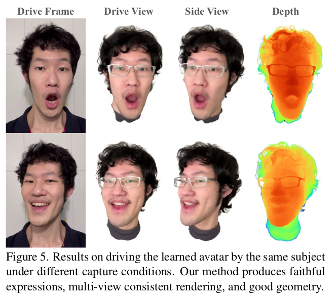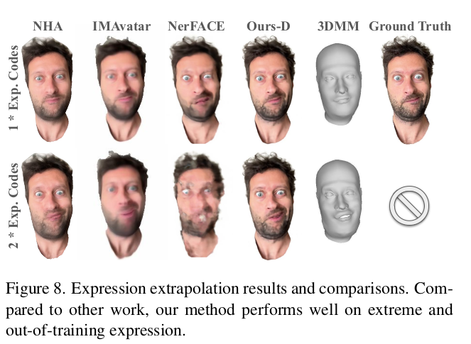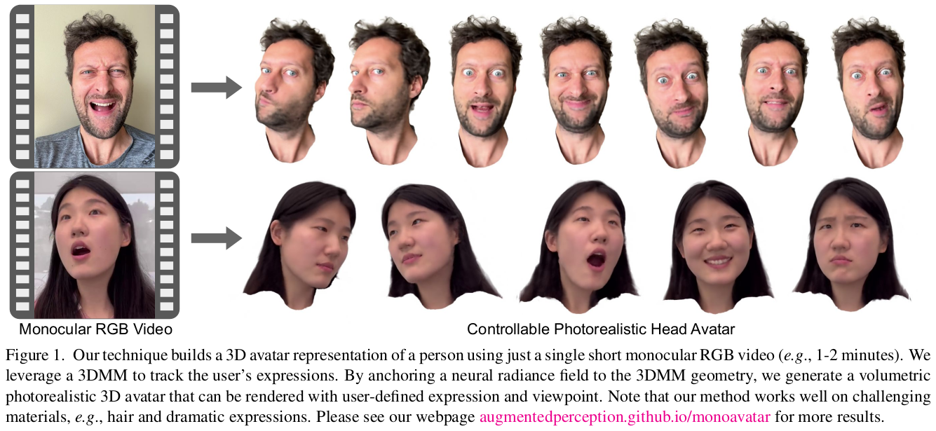 2023 CVPR monoavatar라는 논문으로 video to implicit head avatar 논문이다. 3DMM(FLAME) + NeRF representation으로 다양한 표정의 얼굴 이미지를 찍어낼 수 있다.