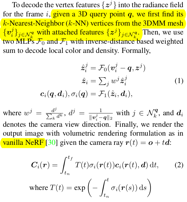 vertex feature가 배정이 끝나면 전처리에서 얻은 camera pose, head pose와 함께 NeRF 방식으로 렌더링함. ray sampling마다 가장 가까운 3DMM vertex feature를 weighted sum으로 구한 뒤 composition해서 렌더링. ![]() |
