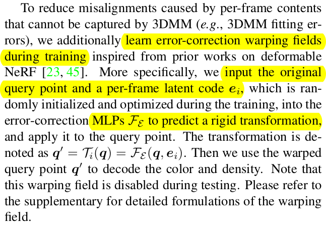 위 과정은 사실 rigid target일 때는 전혀 문제가 없음. 하지만 지금 대상이 사람 머리기 때문에 머리카락이나 옷 같이 non-rigid도 있음 이를 커버하기 위해서 per-frame으로 point level warping을 할 수 있게 만들었다. 한 frame 이 공유하는 frame latent를 네트워크에 추가로 넣어주는 식. 학습이 완료되고 나면 더이상 frame latent는 쓸 필요가 없다. per-frame 변화를 반영해서 제대로 된 아바타를 만들어냈다면 그때부터는 의미가 없기 때문. |