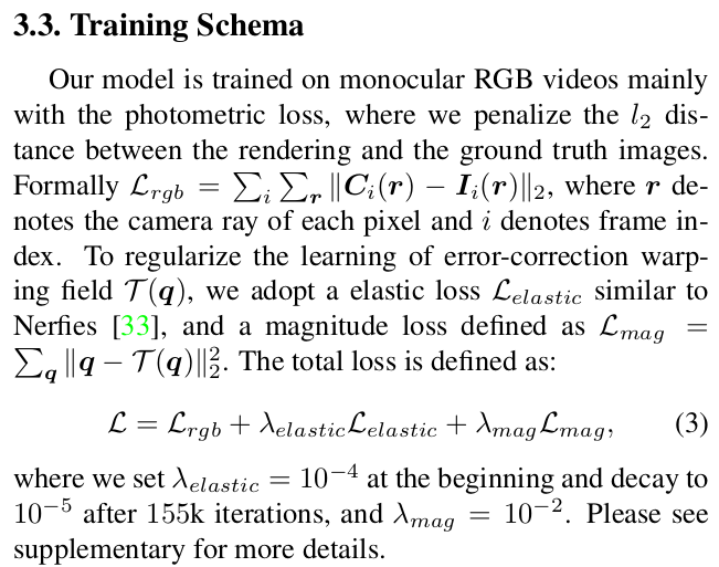 학습은 rendering loss (color loss)가 당연히 기본. elastic loss는 per-frame point warp를 계산할 때 R, t로 나누어서 계산하는데, Jacobian과 R이 비슷하도록, J=USV.T 시 S가 작도록 억제하는 loss다. 의미는 회전변환이 극단적이지 않도록, translation이 엄청 크지 않도록 억제하는 것. 마지막 mag loss를 warping의 기능이 보정이다보니 크기 자체가 일단 작아야 되므로 억제하는 역할. |