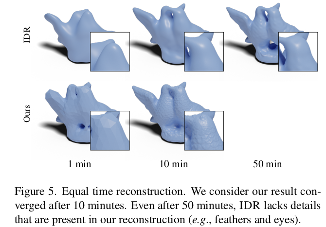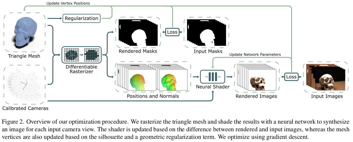 1) 이미지, mask, Mesh (rough init) 들이 입력, geometry 복원만 목표 2) diff. rasterizer(Mesh)로 rendered mask 생성, mask 비교 3) mesh vertex, rendered normal, view direction 입력으로 하는 NeRF MLP 학습, rendered rgb <-> rgb 비교 gradient 흘려보내면 geometry가 변한다. position,x가 업데이트 되면 diff.rasterizer에 의해 normal을 자동계산. |