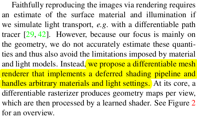 이 내용을 가져와서 multiview image에서 geometry를 만들어내는데, estimated geometry -> position, normal, depth -> shading (<-> loss) 라는 과정이 위 언급한 deferred shading과 동일하기 때문에 neural deferred shading이라고 명명한 듯 하다.