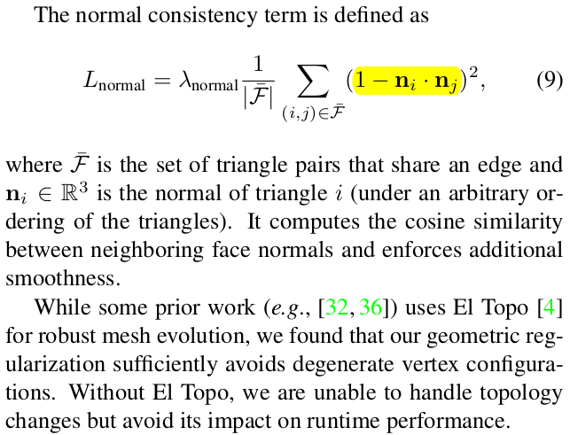 수식(2)와 같이만 디자인하면 mesh vertex가 발산하듯이 변할 것이 뻔하다. 그럴 듯한 mesh vertex 변형을 유지하기 위해서 regularization 필수 1) laplacian cost : 2차미분 값이 0에 가깝도록, 변화가 완만하도록 억제, 부드러운 표면 강제함 2) normal consistency cost : 비슷한 맥락으로 서로 같은 face를 구성하는 vertex끼리는 normal이 같도록 강제함. 부드러운 표면 강제. ---------------- 개인적인 생각이지만 smooth surface를 강제하는 regularization이 2개나 걸려있기 때문에 각진 물체 복원에 불리할 것 같다. 혹은 안이 파여있어 곡률이 심하게 변하는 물체에 불리할 듯. |