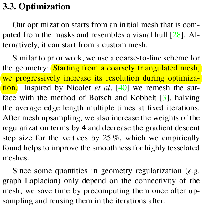 최적화 팁은, 처음부터 face 많은 mesh로 시작하면 잘 안되니 최적화 과정에 비례해서 face를 쪼개 점점 dimension이 높은 mesh로 변형시켜가며 최적화 하는게 좋다고 한다. face subdivision 하는 듯. |