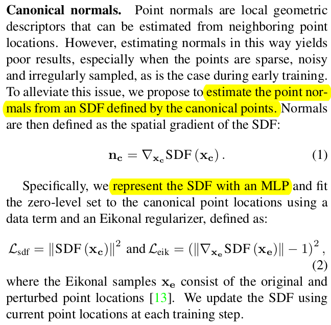 point normal도 뒤에 렌더링을 위하여 구하는데, 그냥 point normal 구하듯이 하면 성능이 떨어지니 SDF 뱉어주는 네트워크를 하나 만들어 네트워크가 smoothing 해준 normal을 구한다. point cloud가 있으니 SDF volume을 계산하고 그걸 GT로 쓴듯 |