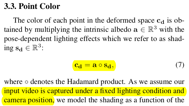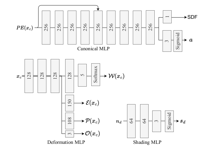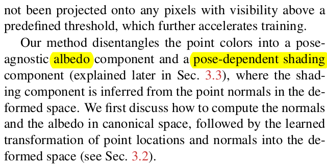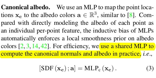 pcd color는 albedo + shading(light, view dependent) 로 나누어서 봄 canonical은 albedo값만 다룸 MLP를 하나두어서 color 예측하도록 함. 사실 NeRF랑 동일 구현상 SDFnet 이랑 합침 |