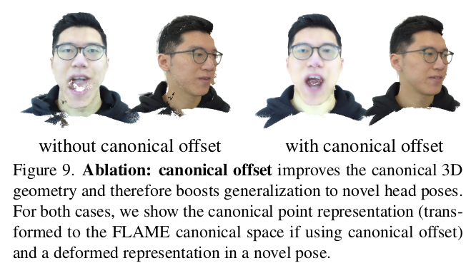 1) canonical point cloud <-> canonical FLAME 대응 관계 만들기 2) canonical point cloud + offset == canonical FLAME vertex로 정의 3) LBS(pcd+offset) 후 렌더링 4) 이미지와 비교. --> point cloud 위치와 offset가 최적화됨. |