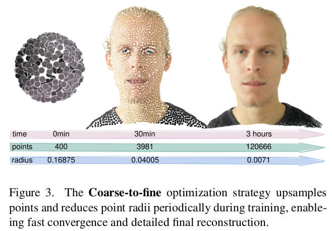 ![]() pcd 초기화는 sphere 형태로 시작, 개수는 적게 시작해서 점점 증가. 중간중간 이상한 위치(어느 시점에서도 안보이는 위치로 이동한 애들은 pruning) 최적화 cost function은 뒤에 나옴. |