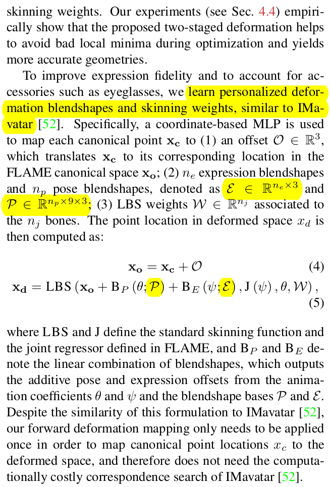 사실 상 핵심 1) canonical pcd + offset == canonical FLAME vertex로 정의한 뒤, FLAME pose, shape parameter를 그대로 사용하는 새로운 blendshape basis를 찾음 (아마 빠른 학습을 위해서 FLAME vertex와 pcd 개수를 맞추고 basis들을 FLAME basis로 초기화하고 시작했지 않을까 싶다...) 2) 여기서 pose basis, expression basis, skinning weight가 학습됨. |