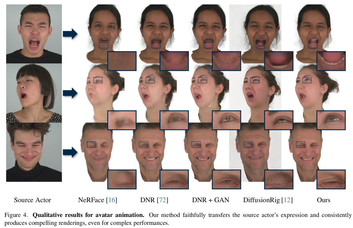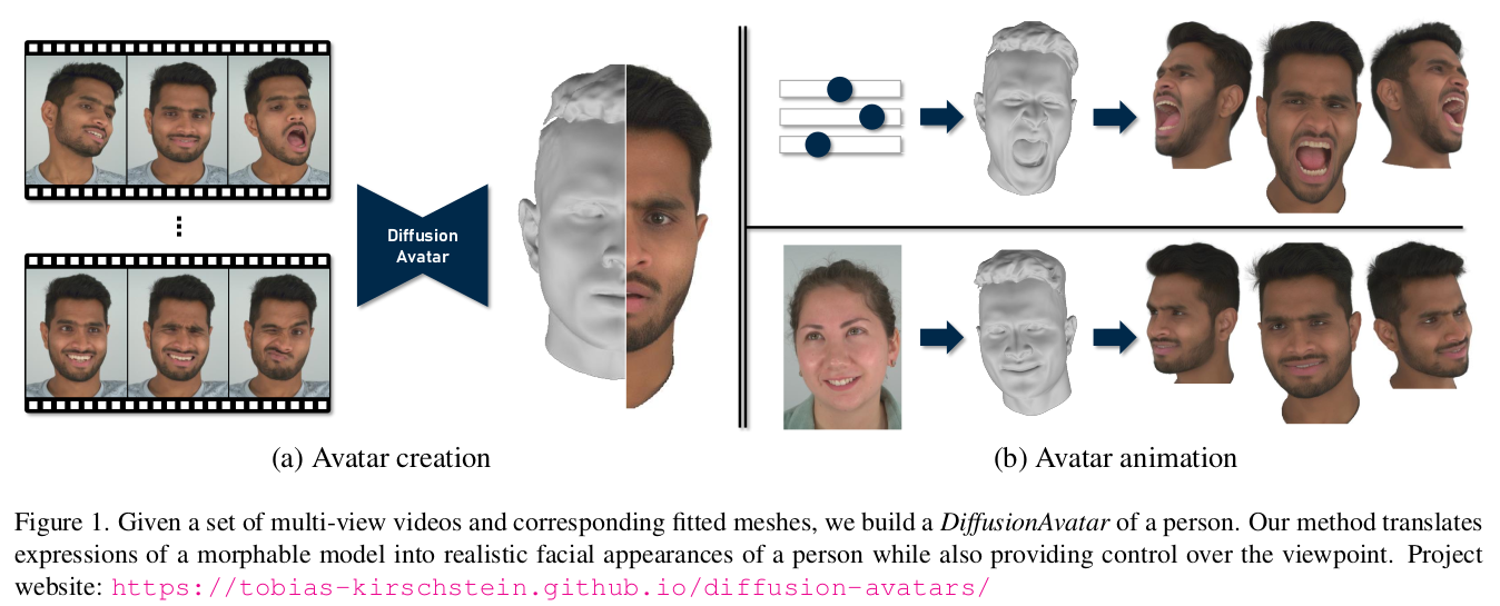 multiview + video 입력을 받아 3D animatable head avatar를 만드는 논문. NPHM (implicit head model) 에 feature를 할당하고, differentiable renderer를 통해 depth, normal, rendered feature를 만든 뒤 이를 diffusion하는 방식이다.
