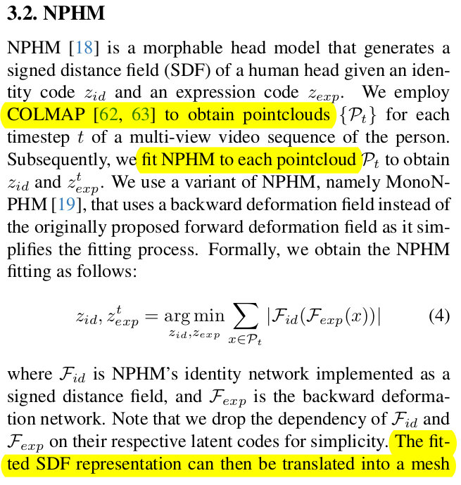 ![]() ![]() 1) multiview video 입력에서 각 frame 별로 모아 COLMAP 복원 2) pcd에 NPHM 피팅 (이 과정에서 model vertex와 대응관계를 따지지 않아도 되니까 implicit 모델을 쓴듯함) 3) NPHM -> explicit mesh by marching cube. |