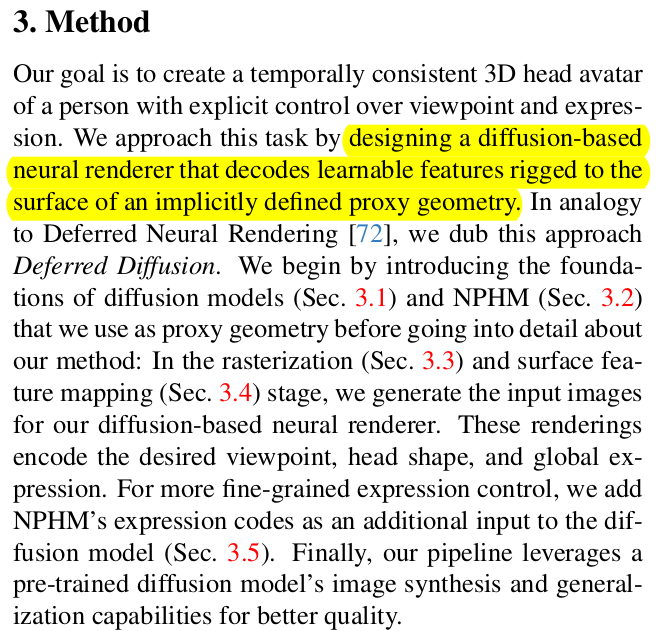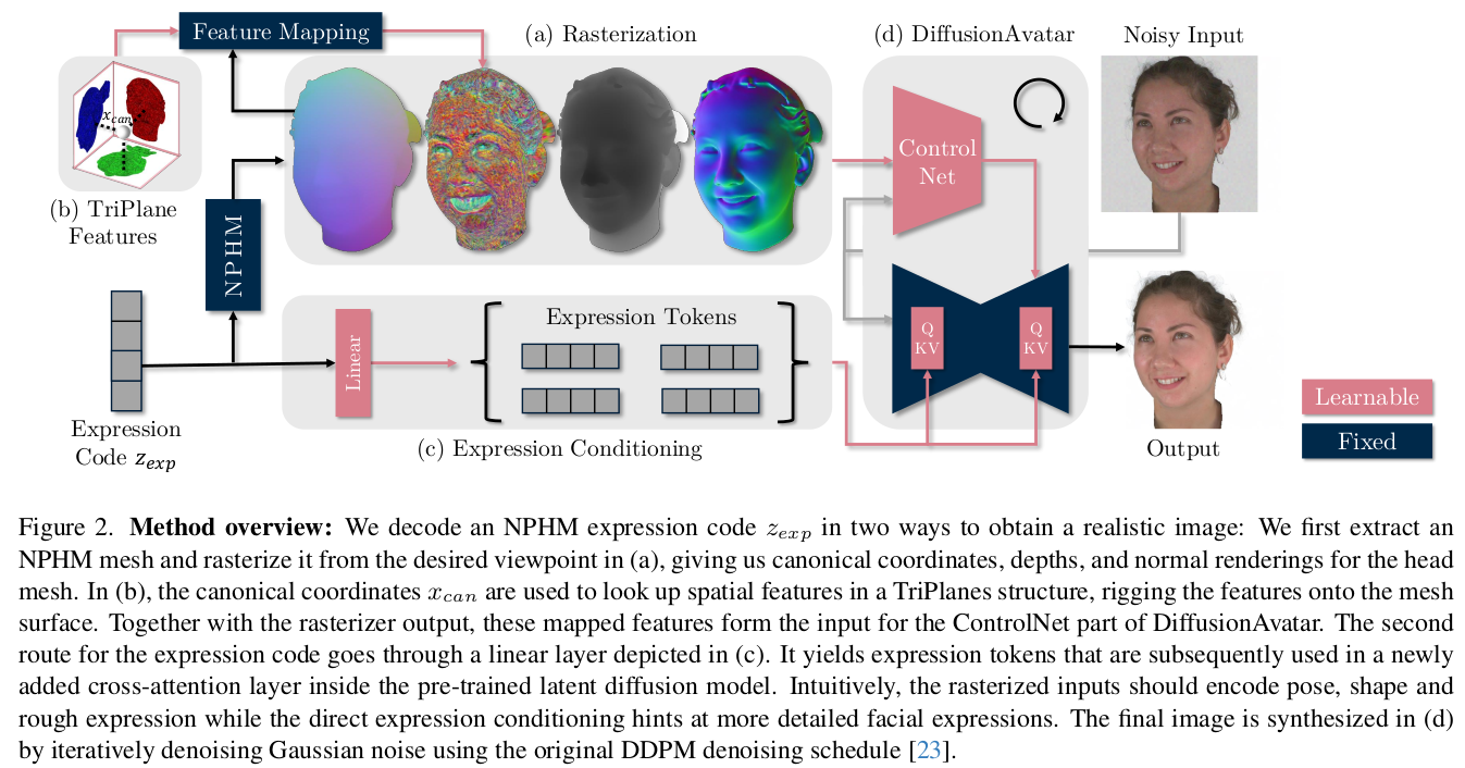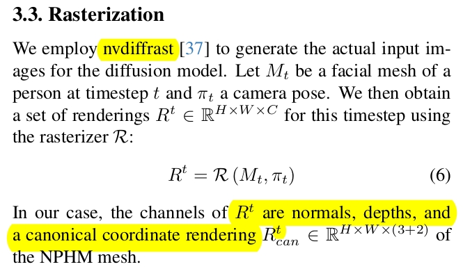1) expression code -> NPHM decode 2) feature 할당 3) depth, normal, feature map rendering 4) diffusion 입력으로 넣고 (ControlNet + IPadapter) 5) 최종 결과에서 rendering loss |