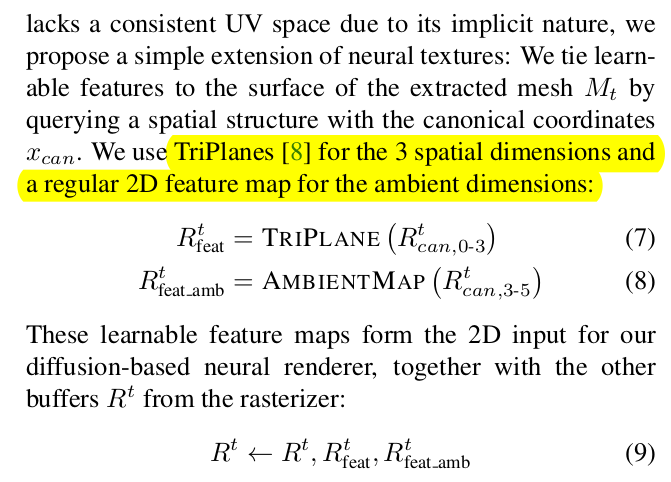 coordinate map (3+2차원)은 그대로 diffusion 입력으로 사용되지 않고 한 번 feature map으로 encoding 됨. xyz를 물리적으로 의미하는 첫 3차원은 tri-plane을 이용하여 feature화 하고 뒤 ambient coordinate 2차원은 그냥 CNN 써서 feature화 함. feature화된 coordinate가 앞의 depth normal과 합쳐서 diffusion 입력으로 들어감 |