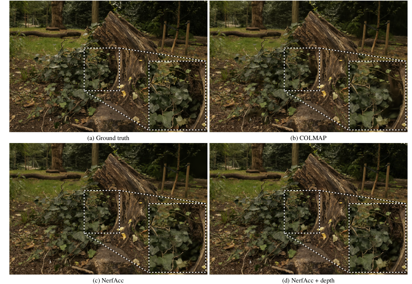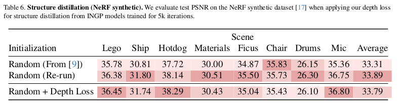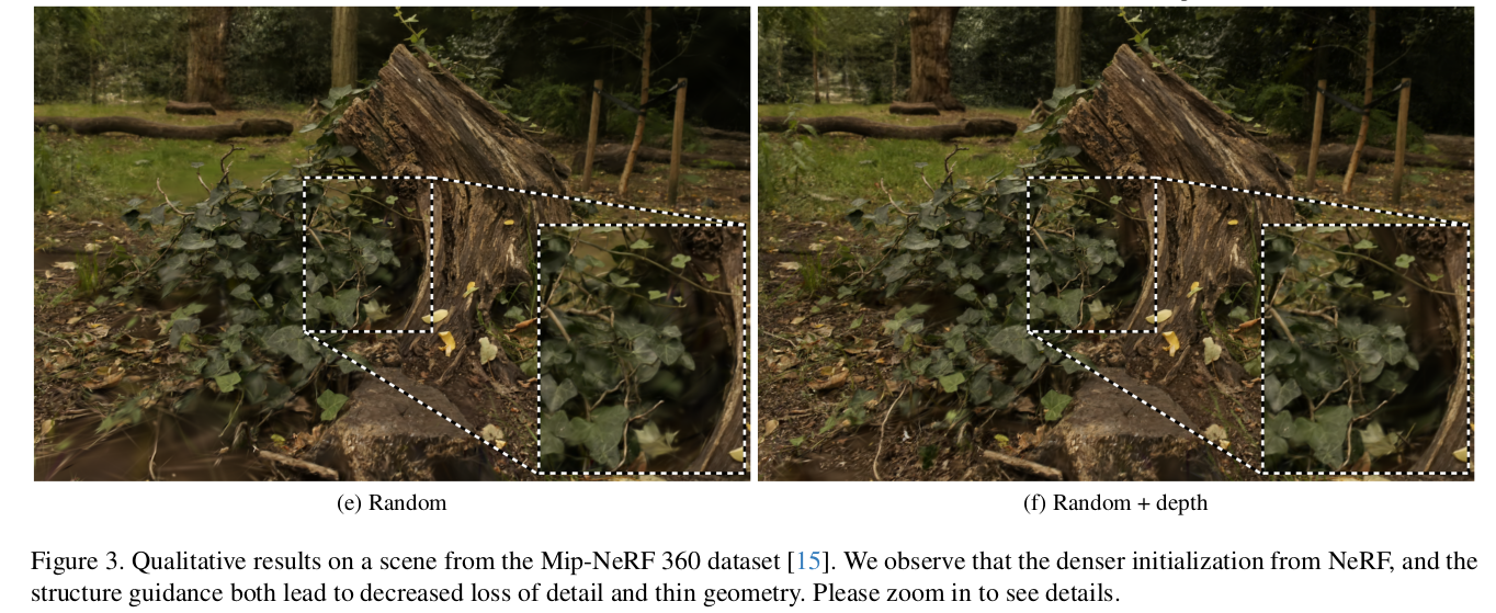 ![]() ![]() 육안으로 봤을 땐 큰 차이가 안나지만, NeRF 초기화 + depth 활용이 디테일이 조금 더 살아난다는 것을 보이고자 한 듯. |