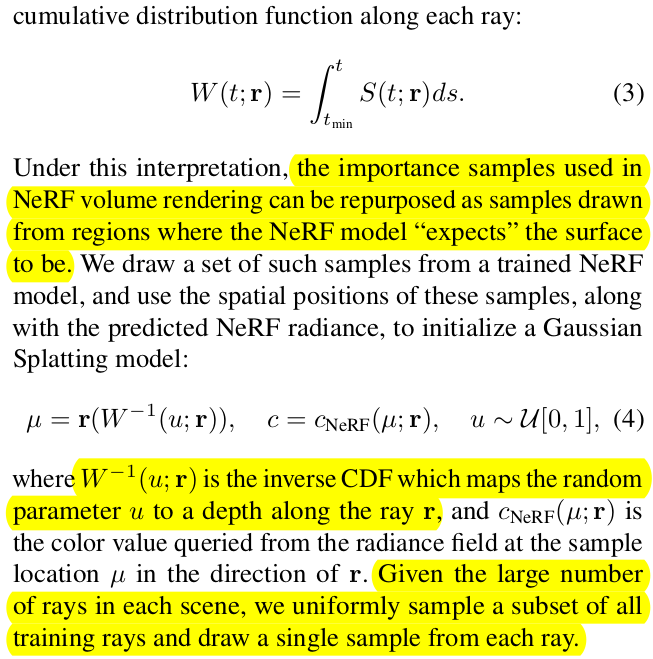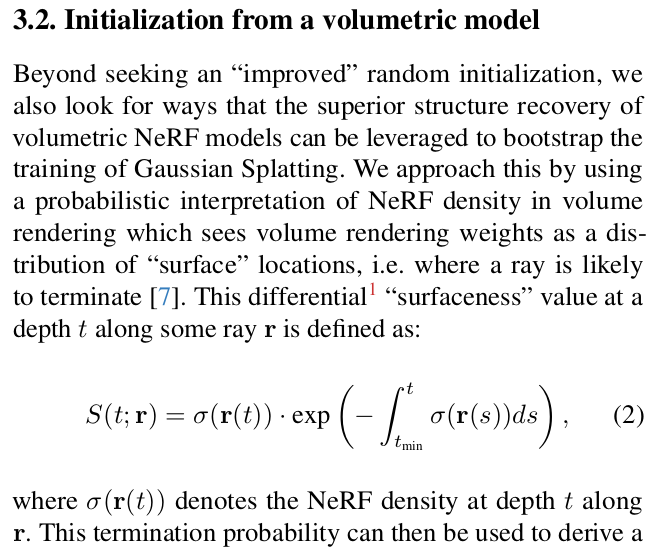 NeRF를 이용한 보조 사실 가장 먼저 생각할 수 있는 초기화 방법은 NeRF rendered depth를 활용하는 방식이다. depth로 구한 초기 위치도 사실 surface에 유사하므로 위의 importance sampling으로 구하는 방식이랑 큰 차이는 없었을 것이다. 근데 저자들은 depth는 따로 빼서 학습 loss에서 기여하도록 했다. 3DGS rendered depth와 NeRF rendered depth가 같도록 regularization을 가해주는 식이다. ![]() |