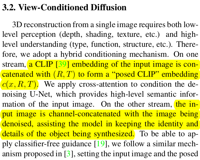 condition embedding은 두 종류 1) CLIP (image) + R + T concat한 형태로 SD에 넣어줌 2) SD 중간 중간 denoised image 뒤에 channel-wise 원본 이미지 concat. |