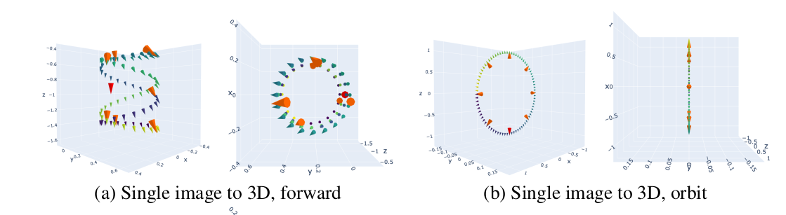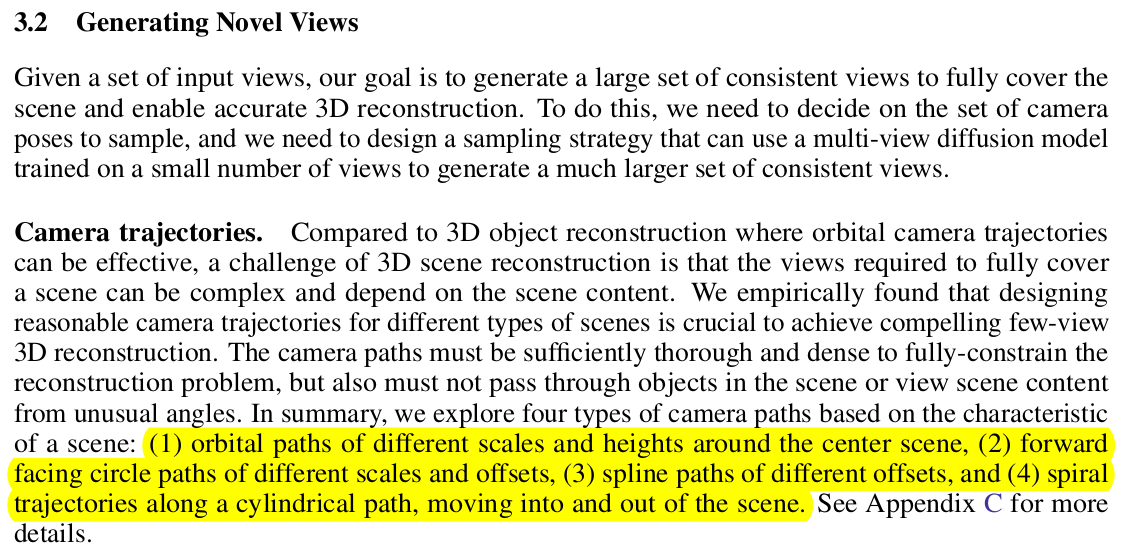 diffusion model이 힘이 좋긴 해도, 새로 생성할 novel view가 기존 view와 겹치긴 해야 잘 생성한다. 따라서 novel view의 camera pose를 생성하는 방식이 조금 제한되는데 위 그림과 같이 물체를 중심으로 뱅글뱅글 돌거나, 물체를 원으로 훑으면서 정면에서 찍는 방식을 사용했다. 2개 더있는데 다 뱅글뱅글임. |