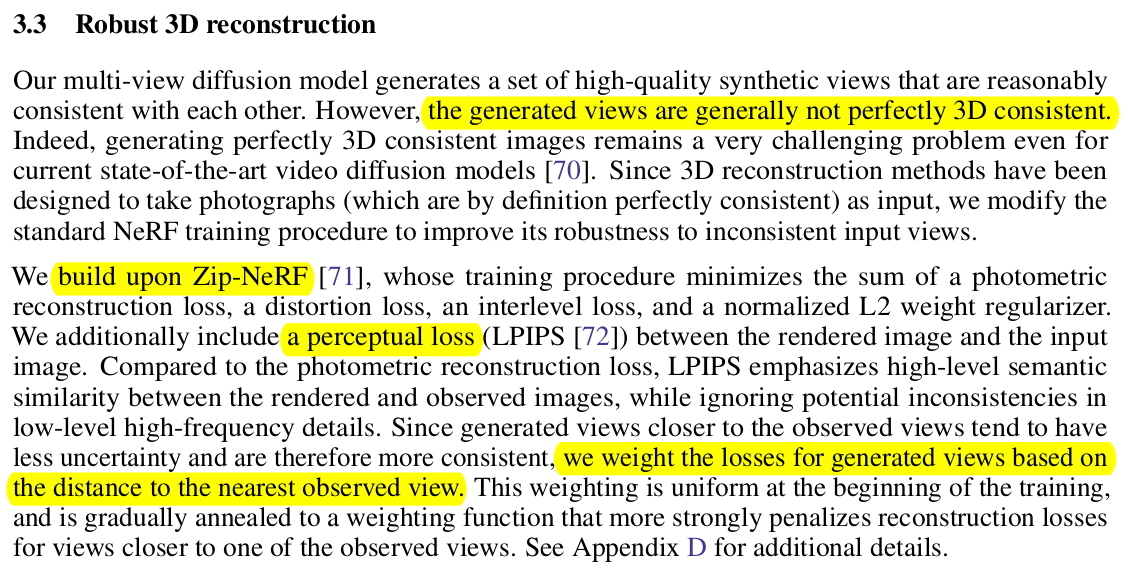 뒤에 따라 붙는 NeRF는 zip nerf 1) perceptual loss 추가 2) 시점이 주어진 시점과 가까울 경우, 가중치 증가 |