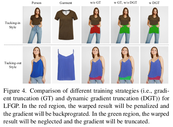 큰 컨셉은 옷 파트 별로 warping field를 예측 한 뒤, warped image를 기준으로 generation하는 것이다. 어설프게 나마 초기값을 잡아줘서 generation 난이도를 확 낮추는 것. DGT 학습 방식은 옷을 넣어입냐 빼입냐, 같은 차이를 반영하도록 유도하는 학습 방식. |