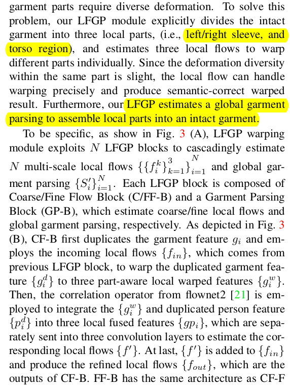 ![]() 말이 길다. 하지만 핵심은 1) pose, segmentation, mask에서 뽑은 pose feature 2) 옷, 옷 segmentatino에서 뽑은 garment feature로 coarse-to-fine, cascade 방식으로 1) 옷 warp field 2) 새로운 자세 옷 segmenation을 예측하는 모듈. flownet2 방식을 따라 구조를 설계했다는데 이제는 굳이 참고하지 않아도 되는 구조. |