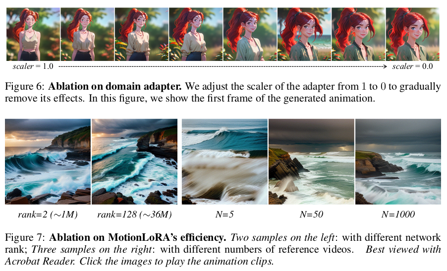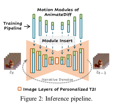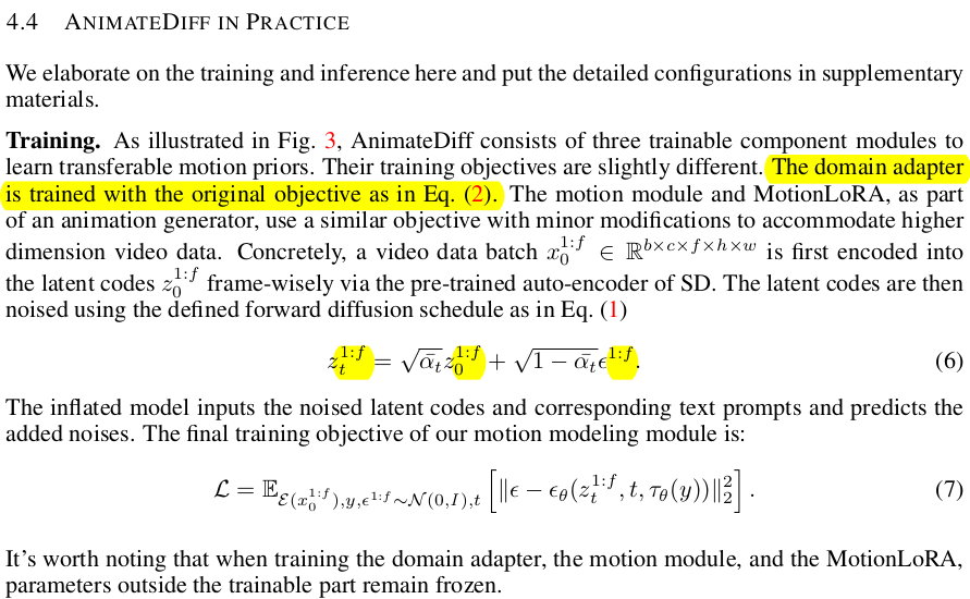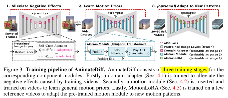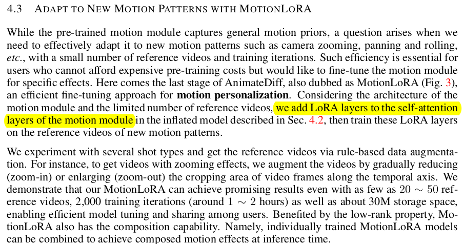 이전에 리뷰한 바가 있으니, 차이점 부분만 언급하면 다음과 같다. 1) 기존 motion module에 LoRa를 추가해서 fine tuning용 데이터가 있을 시 해당 데이터에 특화된 motion module로 업데이트할 수 있도록 함 2) domain adaptation용 LoRa도 추가해서 입력 이미지의 도메인에 해당하는 부분이 LoRa에 의해 encoding되도록 함. |