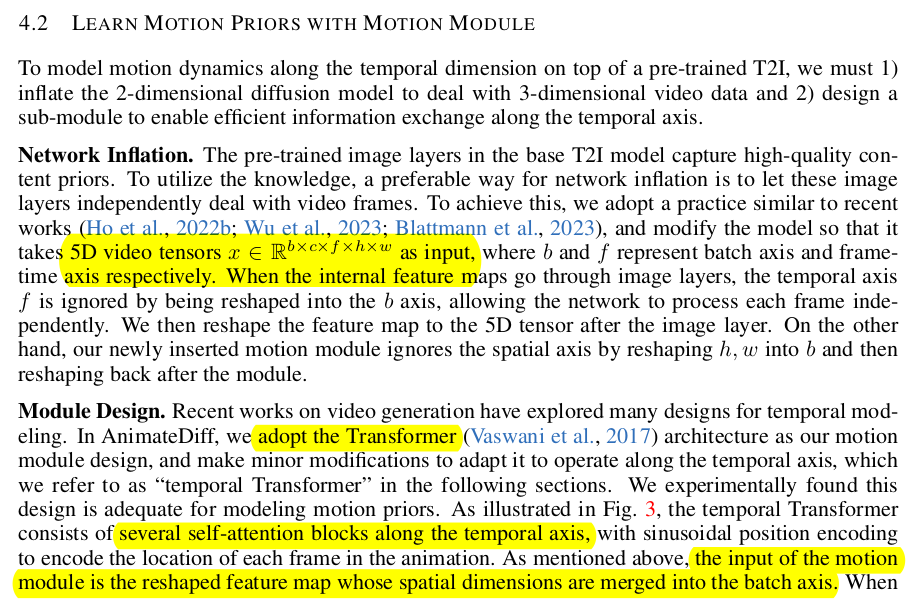 motion module은 똑같음 time dimension이 늘어서 5차원이 된 입력을 다루기 위해 (b h w ) c f 와 같이 batch 차원으로 reshape하는 트릭을 구사함 ------ spatial 정보를 아예 버리는 것 같지만, SD에서는 여전히 쓰고 있기 때문에 여기선 버려도 됨. ----- design tip self attention 전에 PE 넣을 것. 끝나고 zero init. + residual connect 넣으면 좋음. |