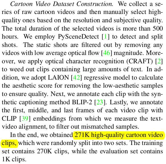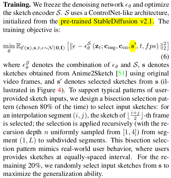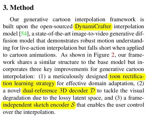 base model을 대량의 카툰 비디오를 먹은 DynamiCraft 모델을 사용함. 1) DynamiCraft의 temporal motion prior를 해치치 않는 선에서 소규모 데이터로 fine tuning하는 방법 2) SD decoder까지 튜닝하는 방법 3) Sketch image를 controlnet으로 ! |