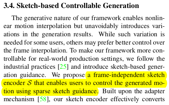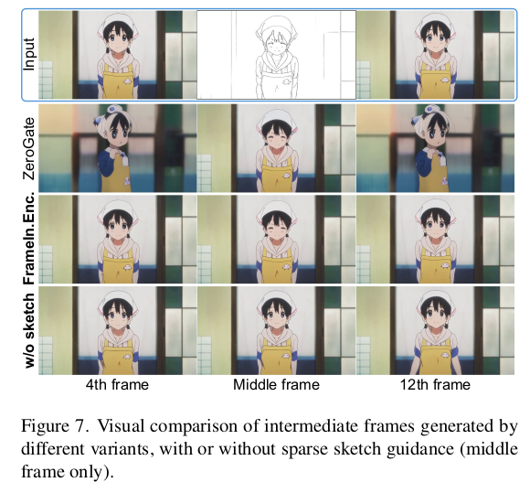 마지막으로 interpolated frame이 그냥 나오는 것도 좋지만, 원하는 대로 컨트롤이 가능하면 더 좋다. -> 실제로 만화가들의 사용성이 증가할 수 있는 부분. 따라서 sketch 이미지를 condition으로 사용하는 controlnet을 붙여주었다. interpolation하는 모든 frame에 각각 다 cross attention이 걸리도록 했으며 1) sketch가 있으면 sketch image가 통과한 controlnet을. 2) sketch가 없으면 empty image가 통과한 controlnet을 cross attention 걸어준다. 꼭 모든 frame sketch가 있어야 하는 것 아님. |