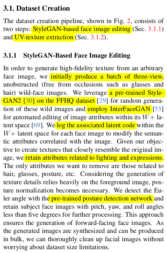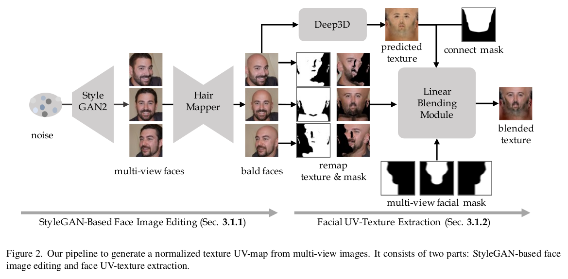 face uv texture map generation 모델이다 보니 대량의 face uv texture map이 필요한데 없다. 따라서 데이터 만드는 것부터 시작함. 1) FFHQ-UV라는 face uv dataset으로 사전학습된 SytleGAN2 + hed pose나 표정 같은 요소 컨트롤이 가능한 INterFaceGAN을 가져와서 Multiview (N=3) images를 만든다. 2) Hair mapper라는 네트워크를 가져와서 머리 영역 segmentation + 해당 부분 대머리로 합성. |