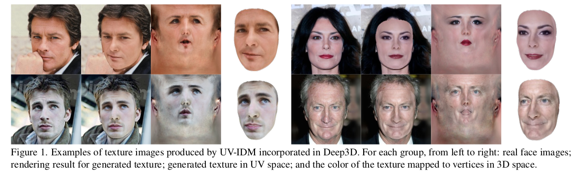 이 논문은 위 사진처럼 얼굴에 사용할 texture만 생성하는 모델이다. BFM model topolgy를 이용하는 방식이고, BFM texture generation 모델이라고 보면 된다. 궁극적으로 하고자 하는 바는 single image가 들어왔을 때 그 안에 있는 사람의 얼굴 texture를 복원해내는 것이다.