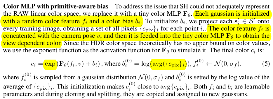 gaussian primitive 중 color SH 제거 color feature를 할당함. color feature는 나중에 MLP를 통과하면 RGBGR 센서 값으로 바뀜 이 때 센서값 범위가 너무 크므로 exp 씌우고 log 씌우는 식으로 scaliling 함 (RawNeRF에서 non linearity 때문에 선형화까지 하면서 loss function 만들어뒀는데 여기서 그냥 exp, log 씌우는 것 옳은 방법이 맞을까) |