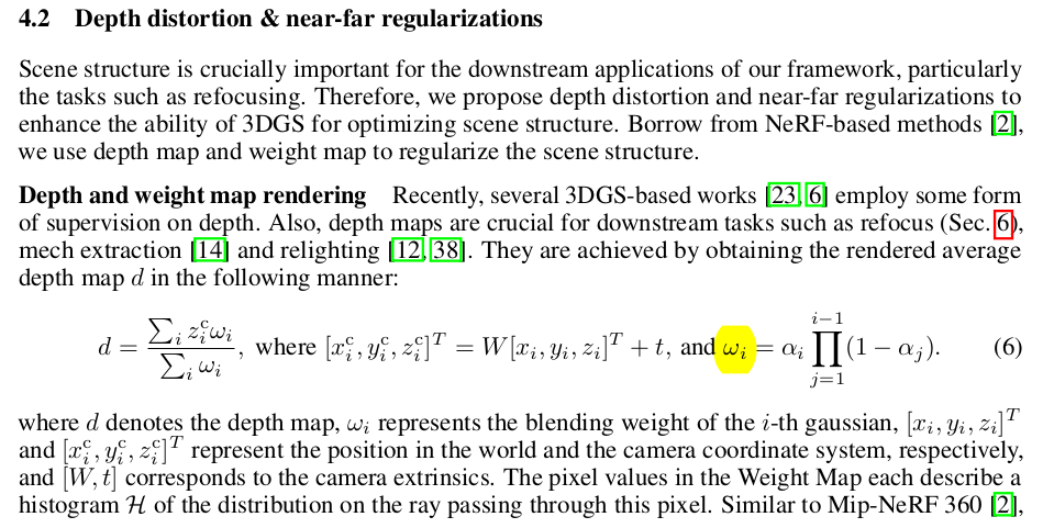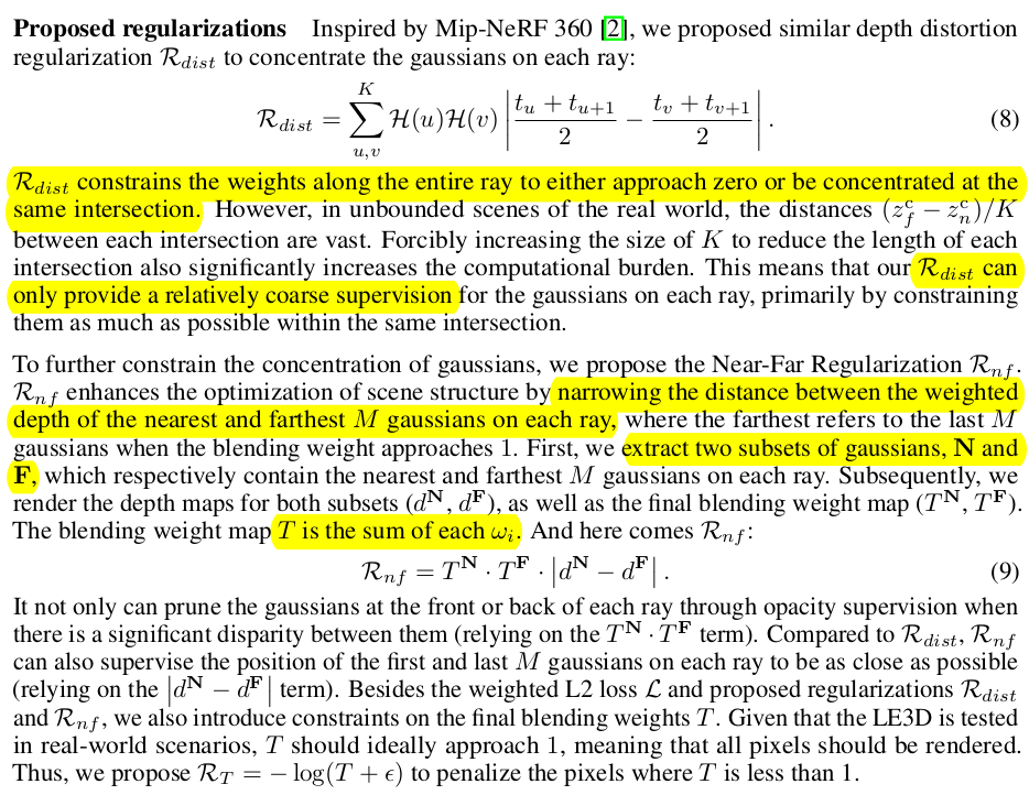 random initialization으로 공간에 gaussian들을 흩뿌려두기도 했고 colmap init 자체도 noisy하기 때문에 gaussian 자체가 실제 geometry 위치에 잘 달라붙도록 하려면 추가 regularization이 반드시 필요함 (이 논문에서 짚은 문제는 아니고 모두가 그렇게 함) alpha composition할 때 계산하는 weight를 ray 내 구간 별로 다 계산을 해둔다. 만약 geometry에 gaussian이 잘 붙어있다면 surface 주변에서만 weight가 높을 테니 ray 내에서 weight가 높은 구간이 1지점 나와야 한다. 따라서 수식 (8)과 같이 ray 내 특정 두 위치를 뽑아서 weight를 비교했을 때 웬만하면 0으로 가도록 기본 골조를 짜고 뒤에 두 위치 간 거리에 비례해서 scale을 곱해줌으로써 거리가 좀 가까우면 0으로 강제하는 힘이 약해지도록 함 -> 먼 위치라면 둘 다 0이어야 한다. -> surface 주변에서 가까운 두 위치를 뽑았다면 0 이 아닐수도 있으니 너무 패널티 주진 말자. 되게 약한 regularization이다. 이게 surface 주변에 gaussian이 생성되도록 강제하는 역할은 사실 아님. 쓸데 없는 위치에서 없어지도록 하는 역할. (그림은 둘다 되는 것 처럼 그린 듯) |