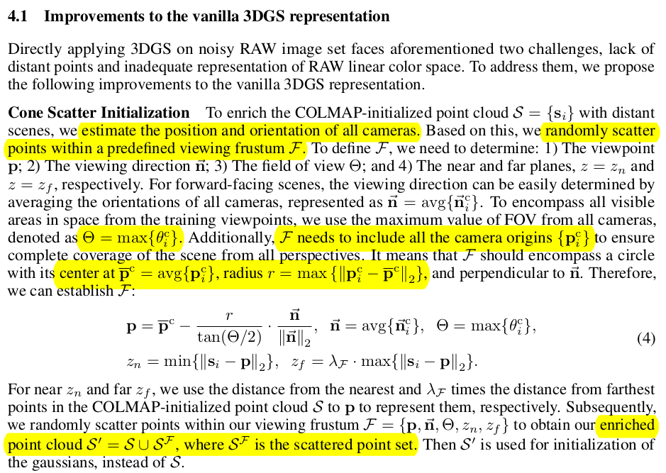 초기화 1) COLMAP 초기화 일단 돌림 2) COLMAP 결과 보고 view frustrum 전체 volume 계산 3) 전체 volume 내에 random initializatio 추가 |