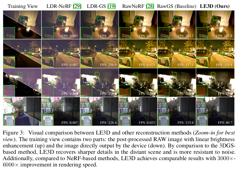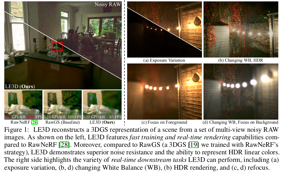RawNeRF의 3DGS 버전. 기대가 컸었는데 사실 RawNeRF에 묻어가는 논문. 새로운 내용은 없고 조합형 논문이다. 3DGS primitive 중 Color SH를 MLP로 바꿔서 RawNeRF 처럼 RGBG 값 그대로 찾아내도록 변경한 것 그리고 Inference할 때 RawNeRF처럼 exposure나 white balance를 조정한 것이다.
