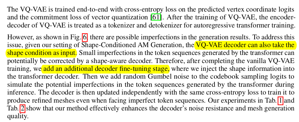 이 부분에 모든 내용이 다 들어있다. 1) trasnformer로 구성된 VQ-VAE를 만들어서 mesh-to-latent-to-mesh를 학습. 2) point cloud to latent를 학습해서 decoder 이전에 연결. 3) inference |