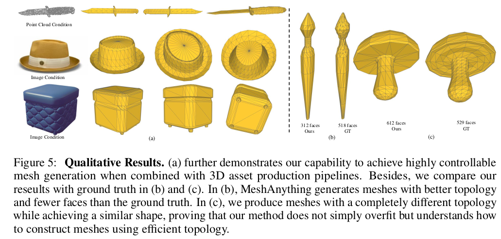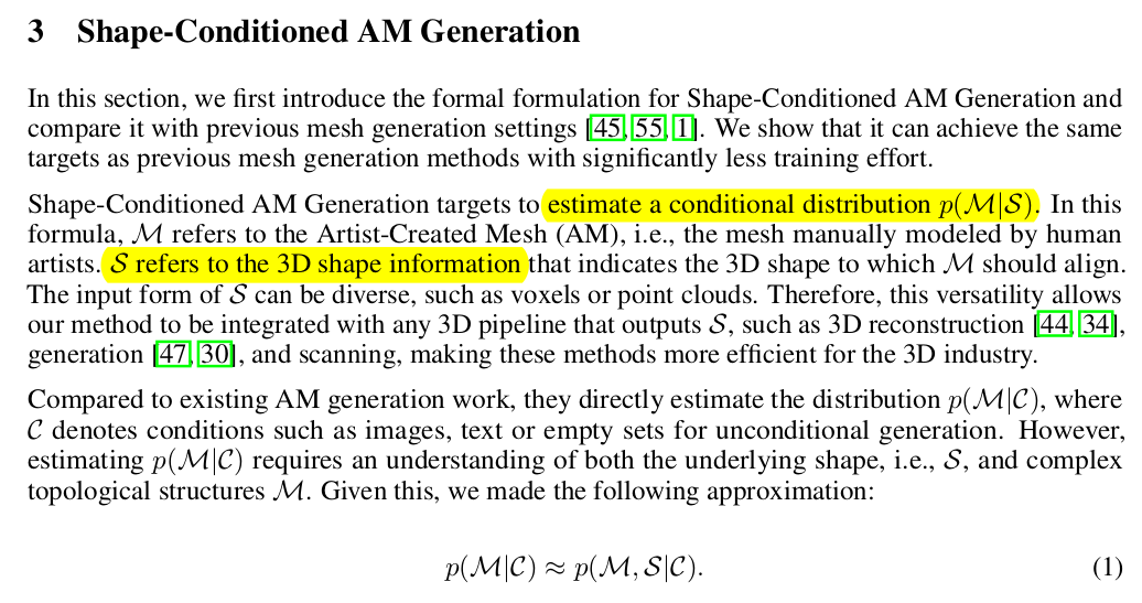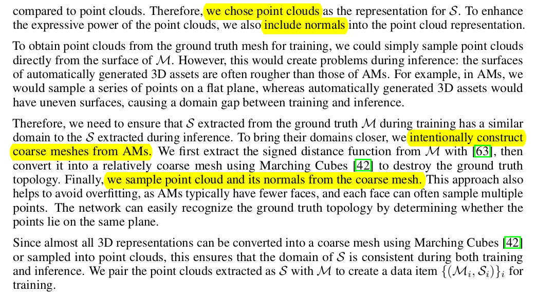 보통 image to mesh, text to mesh와 같이 condition C로부터 mesh를 만드는 것을 생각하는데 point cloud to mesh가 효과적인 이유는 image to pointcloud, text to point cloud 의 결과물이 많기 때문이다. image to mesh를 궁극적으로 달성하고 싶으면 divide-and-conquer 전략으로 pointcloud to mesh만 가능하면 바로 달성 가능하기 때문. |