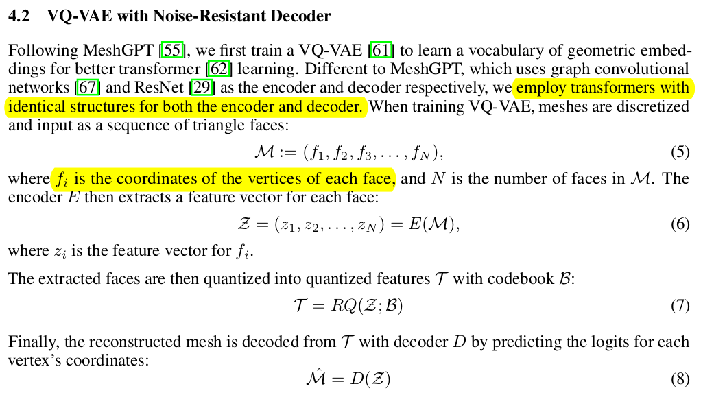 VQ-VAE 사전학습은 MESH face N개를 입력으로 넣고 latent (codebook)으로 압축한다음 다시 N개 face로 복원하는 방식이다. (vertex xyz*3*N) |
