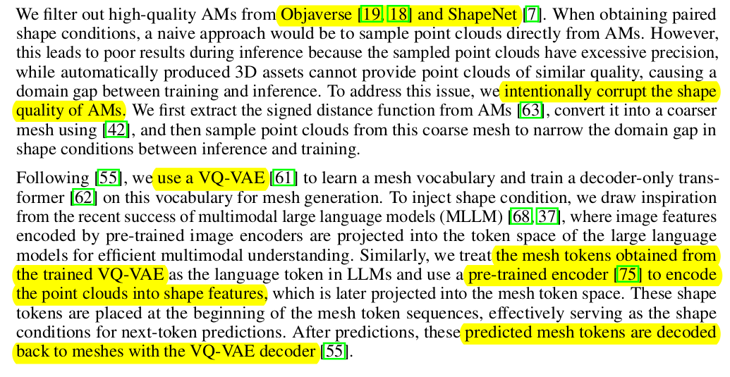 point cloud까지 써서 학습이 최종 완료되면 실제 inference 시에는 point cloud encoder가 뱉은 latent만 다 넣어서 inference하면 된다. ------ 물체 전체의 point cloud를 한 번에 넣는 것이 아니라 국소적으로 N개 씩 끊어서 넣는 방식이고 sliding window하듯이 face가 겹치게 여러번 반복하면서 전체 object를 완성하는 방식 -> 데모를 보면 점점 자라는 방식이다. -> 제목이 autoregressive가 들어간 이유. |