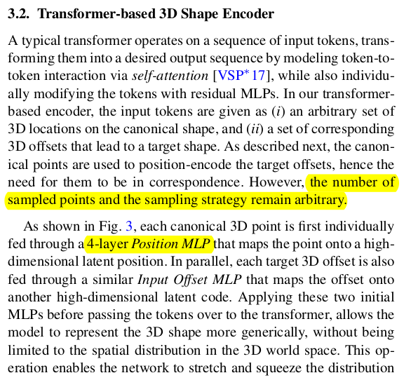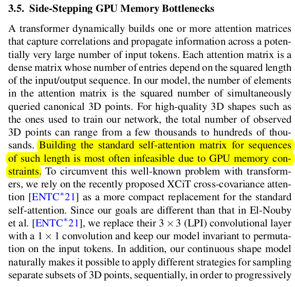 임의의 N query point를 다룰 수 있긴 하지만 웬만해서 N을 mesh 전체를 덮을 수 있도록 크게 넣어야 한다. 이러면 NxN self attention complexity가 엄청 커지므로, 조금 줄일 필요는 있음. 이건 XCiT 에서 쓴 노하우를 썼다고 함(여기선 생략) |