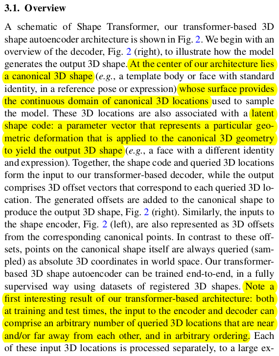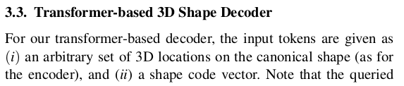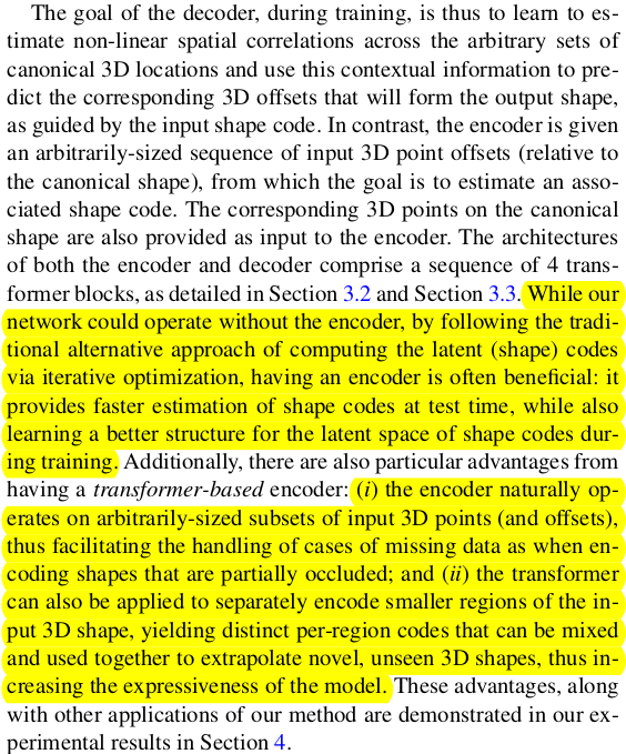 shape code를 만들 때 그냥 learnable shape code를 SCAN마다 부여하고 최적화하는 식으로 구현할 수도 있었을 것. 하지만 굳이 3D point query offset을 입력으로 받는 경우를 만든 이유가 있음 1) 임의의 3d point를 다룰 수 있어야 함. -> shape code to N point의 N을 조절할 능력이 최적화로 찾으면 없음 2) local region 표현력을 가질 수 있도록 하기 위함 -> 만약 최적화로 찾았다면 shape code는 무조건 global code임 -> mesh의 일부만 사용하기 싶다하면 선택지가 없음. |