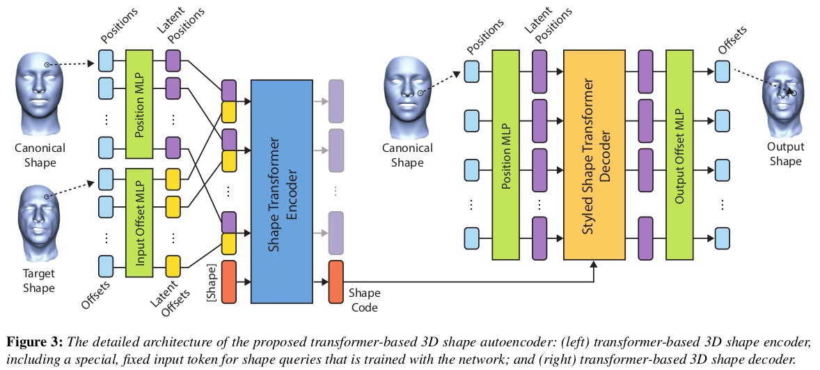 구조는 위 그림을 보면 이해할 수 있으니 설명 생략. transformer를 쓴 이유는 몇 번을 설명하지만, 임의의 N point 입력을 받을 수 있도록 자유도를 열어주기 위함 + global/local 둘 다 가져갈 수있는 아키텍처임 shape code는 encoding transformer 결과에 MLP 달아서 뽑아내는 방식 아니고 token을 추가해서 넣어주고 결과로 나오는 해당 token을 사용함. 나머지 token은 버림. |