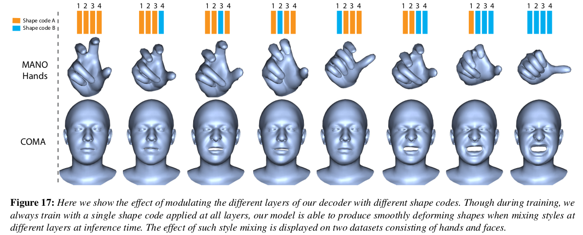 이 논문은 이러한 문제점을 푸는 하나의 방법을 제시한다. 3D SCAN을 공통으로 표현하고자 한다는 것을 기준으로 서로 다른 topology로 표현된 mesh들을 모아 단 하나의 space로 모으는 작업을 했다. 보다 구체적으로 보면 mesh topology와 무관하게 mesh vertex를 갖고 shape code를 생성해둔다. 3d point to shape code, shape code to 3d point만 학습해놓는 것이다. 이러고 나중에 특정 topology화할 필요가 있다면 shape code만 기억했다가 해당 topolgy에 따라 결과 3d point를 다시 묶어주는 식이다.