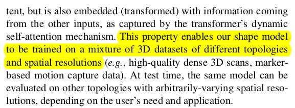 ![]() 그림 보면 이해하기 쉬움. 1) mesh model registered on 3D SCAN <-> 2) mesh model in canonical 대응 데이터가 있어야 함. 1) - 2) offset을 입력으로 넣고, 대응되는 canonical mesh point를 position encoding해서 넣어줌 shape code 생성 shape code로부터 앞선 position encoding값 똑같이 넣어 다시 offset을 생성하는 일종의 VAE를 학습 ------------------ 학습할 때는 topology 정보를 사용함. SCAN <-> canonical tracking이 되어야 하니까. 하지만 결국 입력을 3d point query이기 때문에 학습만 된다고 하면 topology 정보는 inference할 때 전혀 쓸모없음. implicit하게 배우는 것. |
