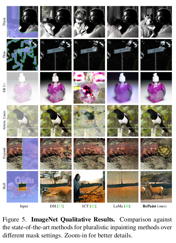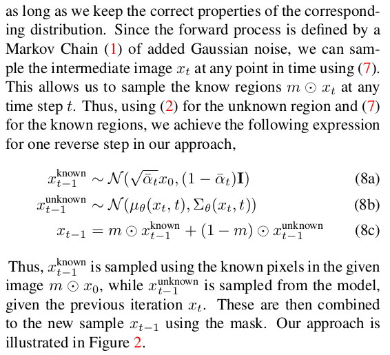 이 논문은 제목에서 바로 알 수 있다시피 DDPM 즉, diffusion model을 이용해서 이미지 inpainting하는 방법을 설명한다. 특이한 것은 별도의 튜닝이나 재학습, loss 추가 이런 것이 없다. 기존 학습 완료된 DDPM을 "어떻게 활용하면" 아무런 수정없이 inpainting 문제를 풀 수 있는지 아이디어를 설명하는 논문이다.간단하지만 효과적이고 납득 또한 가능한 방법.