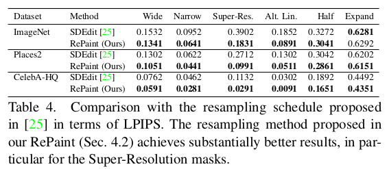 총 denoising step * 왔다리 갔다리 중 step 수가 늘어나는게 중요할까, 왔다리 갔다리 횟수가 늘어나는게 중요할까. 왔다리 갔다리가 더 중요하다고 한다. denoising step을 적게 가져가더라도, 왔다갔다를 많이 하면 성능이 좋아짐. |