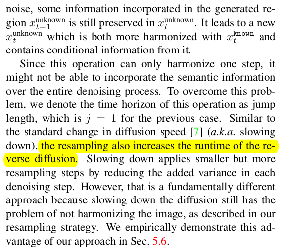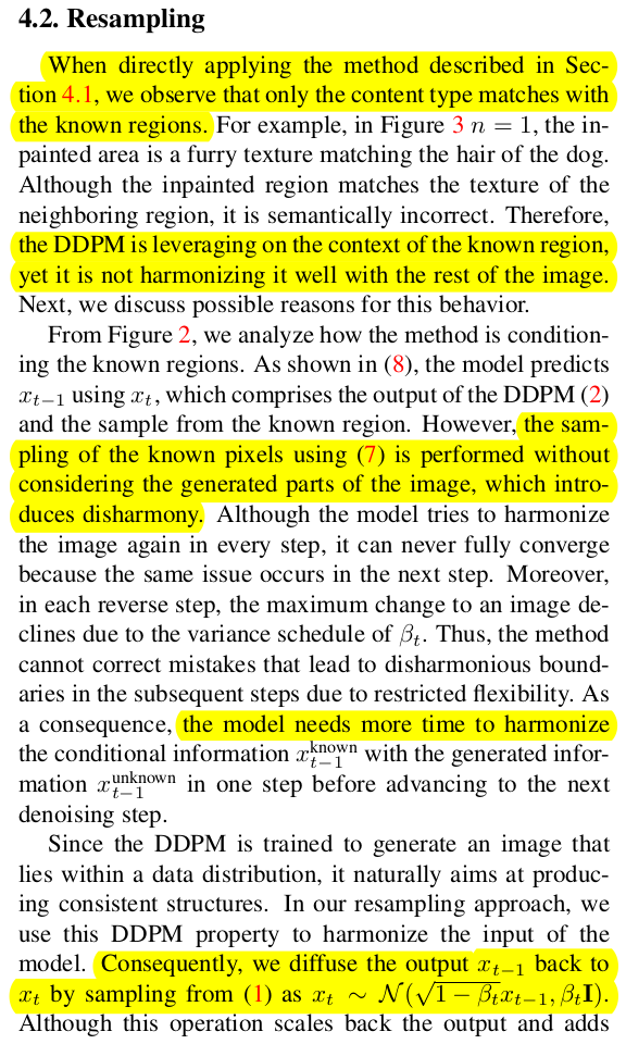 근데 이 방식은, 하나 리스크가 있다. 학습 완료된 diffusion model이기 때문에, 원본 영역에서 뗘온 noise를 이용해서 masekd region noise를 생성하는 방법을 배울 순 없다. 따라서 지맘대로 생성할 확률이 매우 높다. ![]() 실제로 잘 안된다. 자연스럽긴 한데 semantic하게 봤을 때는 틀리게 생성한다. ------------ 이를 해결하기 위해서 T -> T-1 로 Denoising 한 번 할 때, masekd region 갖다 붙이기를 여러번 반복한다. T->T-1 후 mask로 조합 그리고 T-1 -> T로 다시 forward denoising 했다가 , fusion된 결과를 다시 noising하고, 그걸 또 denoising하고, 다시 fusion하고 또 다시 noising 하고 이런 식으로 왔다리 갔다리 하는 것이다. 이렇게 하면 masked region과 unmasked region 간의 정보 점차 섞이게 된다고 함. 1 step denoising할 때 이렇게 왔다리 갔다리를 많이 반복하면 실제로 좋아짐. ![]() |